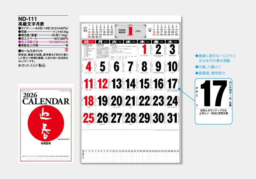 晴雨表、健康豆知識、農事暦など毎日の暮らしに役立つ情報を満載。人気の高い実用的なカレンダーです。ホットメルト製本です。
